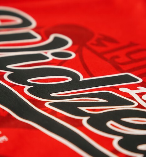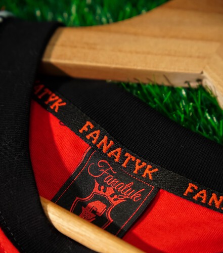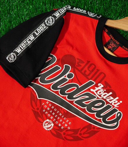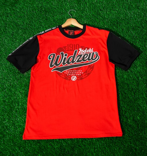 Czerwona koszulka o sportowym charakterze, wykonana z wysokiej jakości bawełny. Kontrastujące czarne rękawki zostały ozdobione stylowymi lampasami, które nadają całości dynamicznego i nowoczesnego wyglądu. Na przodzie koszulki znajduje się wyrazisty klubowy nadruk, podkreślający przynależność i tożsamość drużynową. Idealna zarówno na mecze, treningi, jak i do codziennego noszenia dla fanów sportowego stylu.